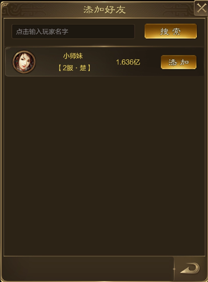 【添加好友】 常言说得好,不打不相识。在《王者征途》这款游戏里,时常能邂逅志同道合之人,这时就可以向他/她发出添加好友的申请。 1、直接添加 在聊天频道或者“排行”之类的场景当中,点击他/她的名字,便会弹出可操作的选项框,点击“添加好友”,就会给对方发送申请,等对方同意之后,双方就正式成为好友了。