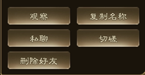 【好友管理】在“好友”界面,点击好友对应的栏位,即可弹出可操作选项框,在这里能够选择与好友私聊、观察好友、切磋、复制名称,或者删除好友。