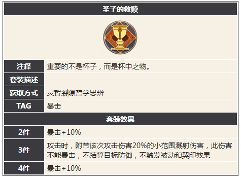 3件效果:攻击时,额外附带本次攻击伤害20%的小范围溅射伤害。该溅射伤害无法暴击,不计算目标防御,且不会触发被动与契印效果。