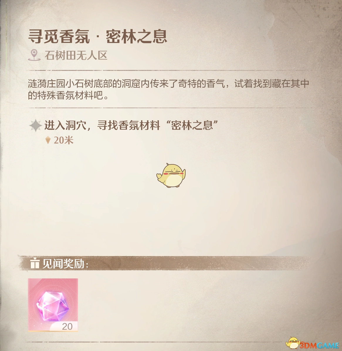 在涟漪庄园小石树的底部洞窟里,飘出了一股奇特的香气。尝试去探寻隐匿于这洞窟之中的特殊香氛材料吧。