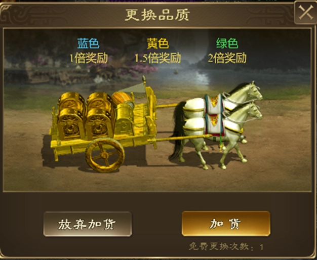 玩家接取镖车后,能够选择“加货”来更改镖车品质。一般来说,绿镖车与紫镖车无需加货,而蓝镖车和黄镖车则会选择更换品质。首次加货不收取费用,后续加货则需要消耗一定数量的绑金。