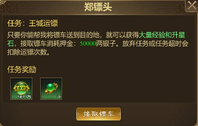 押金:接取镖车消耗一些银子作为押金,运送成功会返还;