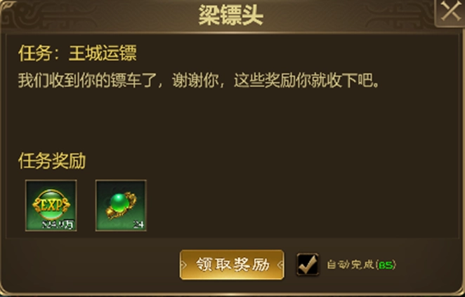 成功将接取的镖车护送至边境“梁镖头”NPC处可领取奖励;