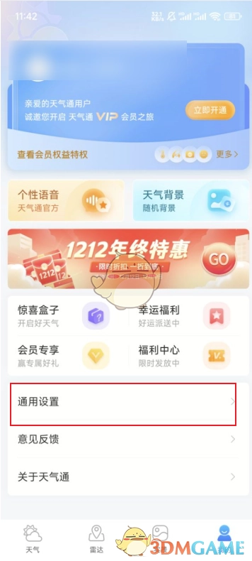 1. 打开天气通app,轻点右下角“我的”界面,再点击“通用设置”。