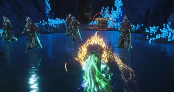 4、在图示位置开启宝箱,可获取【兜鍪】,之后前往阴兵聚集的地方获取【铁枪】。