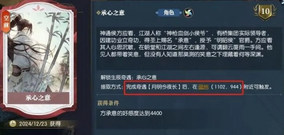 1. 当方承意好感度达到4400时,触发卡片,接着前往磁州(1102,944)接取任务。