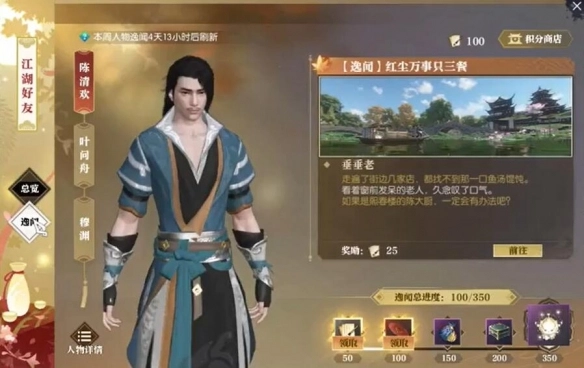 首先,打开逸闻,找到NPC【陈清欢】,接着接取任务【红尘万事只三餐·垂垂老】。