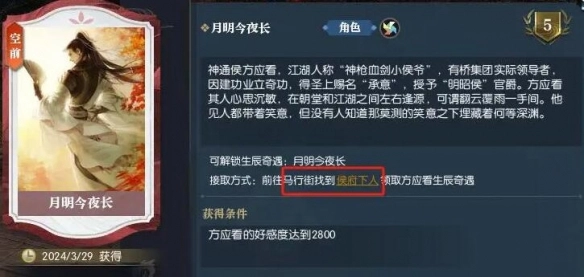 1、需先将方承意好感提升至2800,才可触发卡片,点击该卡片后前往汴京(463,432)接取奇遇任务。