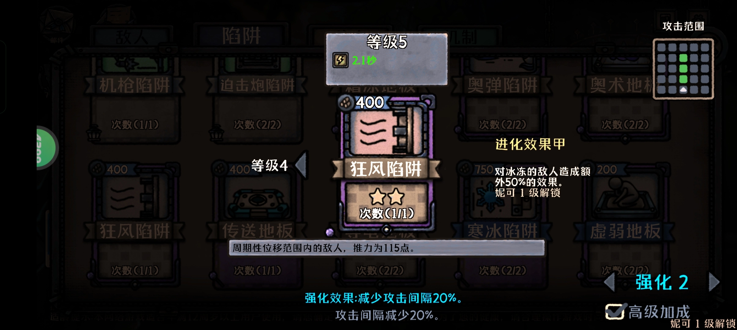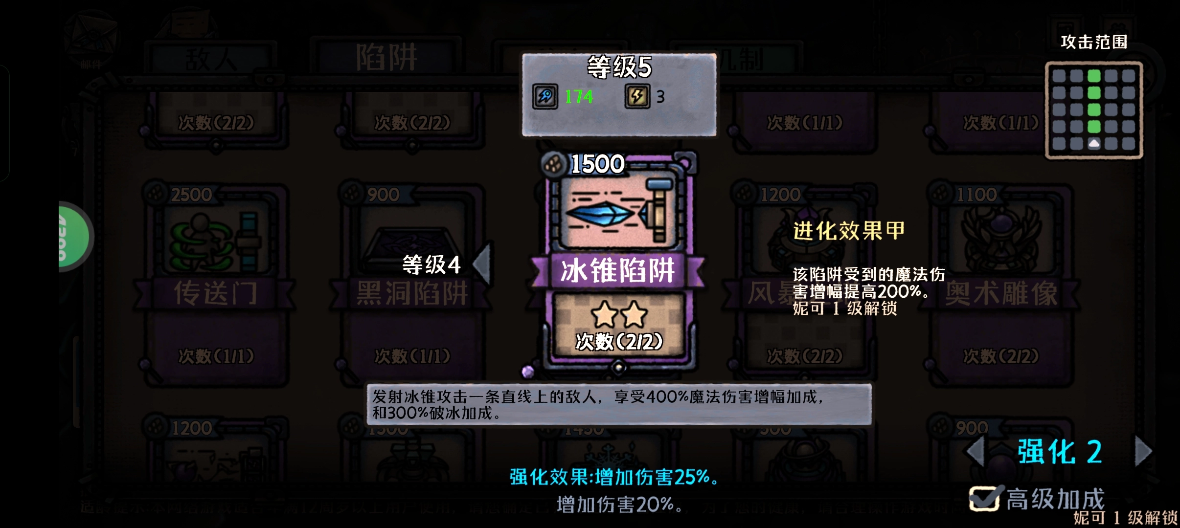 寒冰流玩法如下:前期,初始牌奥术地板升至2☆,在商城开启分支乙以及获取高级加成(详情见图1)。接着,将初始牌霜冻地板也升级到2☆ 。选牌方面,只拿1张增幅之塔并升为2☆,1张水元素升为2☆ ,还有1张狂风陷阱(要是早期就拿到,可不升奥术地板,直接拿它升星,此牌非常好用,分支选甲)。后期拿1张冰锥陷阱升2星,毕竟它是橙色牌,前期较难刷到。