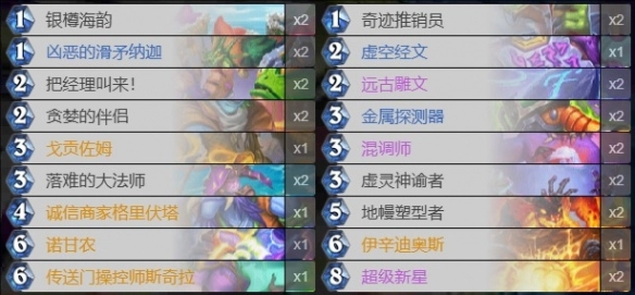1. 起手留存的牌为:戈贡佐姆、奇迹推销员、凶恶的滑矛娜迦、金属探测器、贪婪的伴侣。