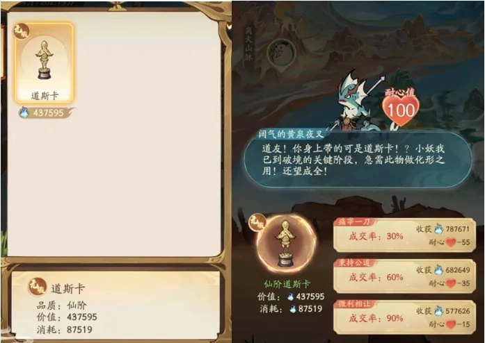 3、轮回秘境中获取法宝的场所大致分为几类,分别是封印类、镇压类、交易类和赌石类。当遇到通过封印类、镇压类以及交易类方式获取法宝时,我们刻意选择成功率最低的选项,主动求败(毕竟即便成功了,收益也比选择2、3时更高)。如此一来,就能避免背包里积攒过多低品阶法宝。