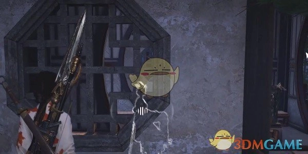 1、返回酒楼三楼,沿楼梯左转,在横梁上找到一个书生。