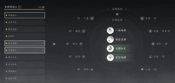 1、选择不同的特殊职业会增加不同的志趣属性,游戏开局最多只能选择50点特质点。