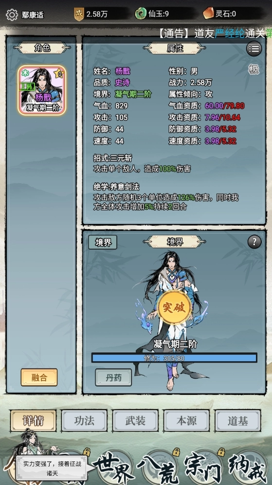 7、当修为达到特定程度时,点击人物图标,接着点击“突破”选项,即可提升境界。