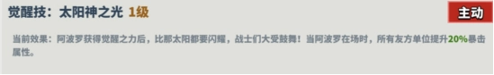 获得觉醒之力的阿波罗,光芒竟比太阳还要耀眼,这一幕让战士们备受鼓舞!只要阿波罗身处战场,所有友方单位的暴击属性就能提升20% 。
