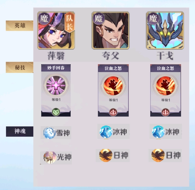 组合英雄配置:萍翳(担任队长)搭配夸父与干戈。