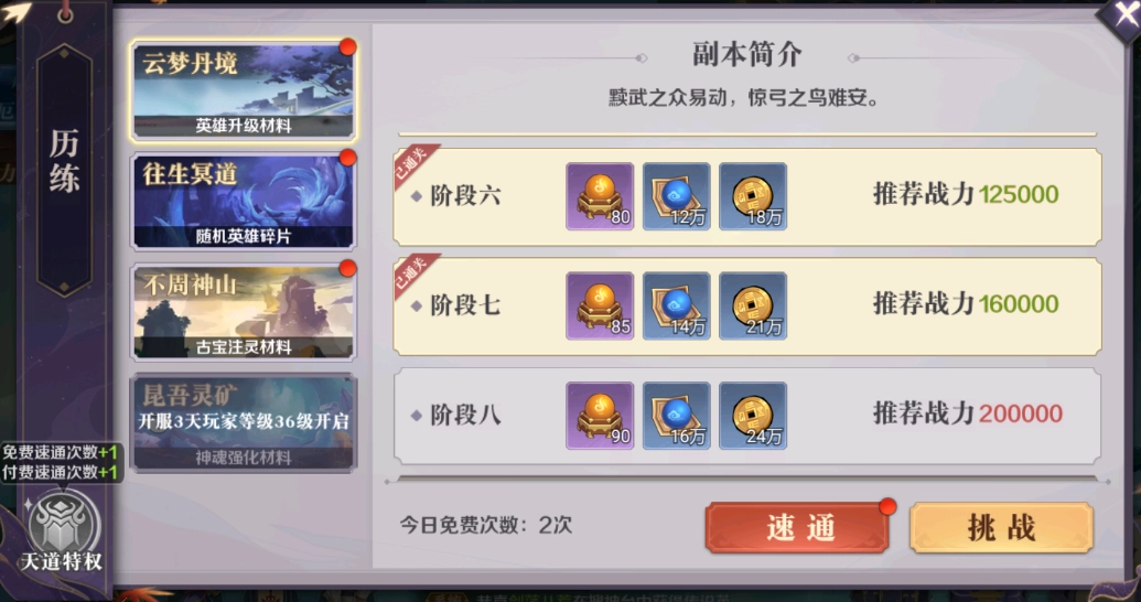 不少人大概把历练当作游戏副本了,每天一上线就先进行扫荡。但这种做法实际上可能会损失部分资源,毕竟在前期,每天角色的提升幅度都相当可观。简单来讲,先把能提升的地方都提升完,再去挑战,等到挑战到打不过的程度,这时再来扫荡,这样更为合适。要知道,在前期哪怕只领先一点点,都至关重要。