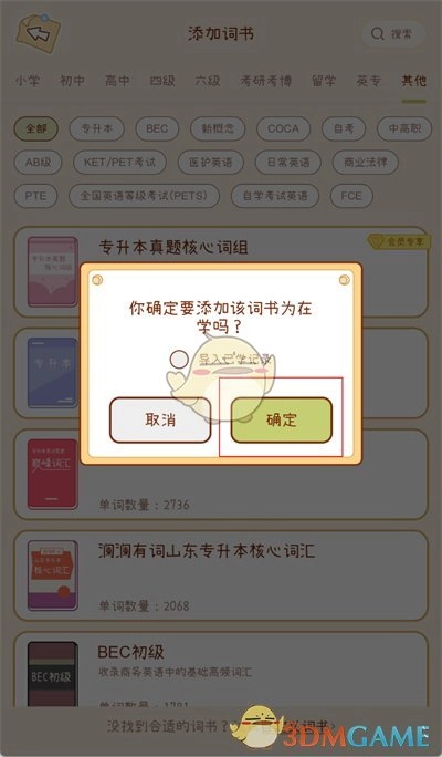 3、随后进入词书选择页面,在此能够查看各类词书,并挑选想要添加的词书。