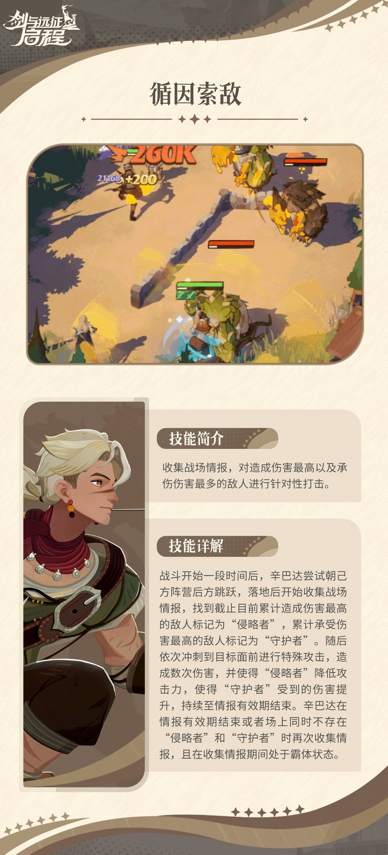 效果呈现:战斗开启6秒之后,辛巴达将会跳跃至我方阵容后方,展开情报收集工作。届时,会把敌方输出伤害数值最高的角色设定为“侵略者”,而将敌方承受伤害最多的角色定义为“守护者”。针对“侵略者”,会削减其60%的攻击力;针对“守护者”,则会提升40%对其造成的伤害。