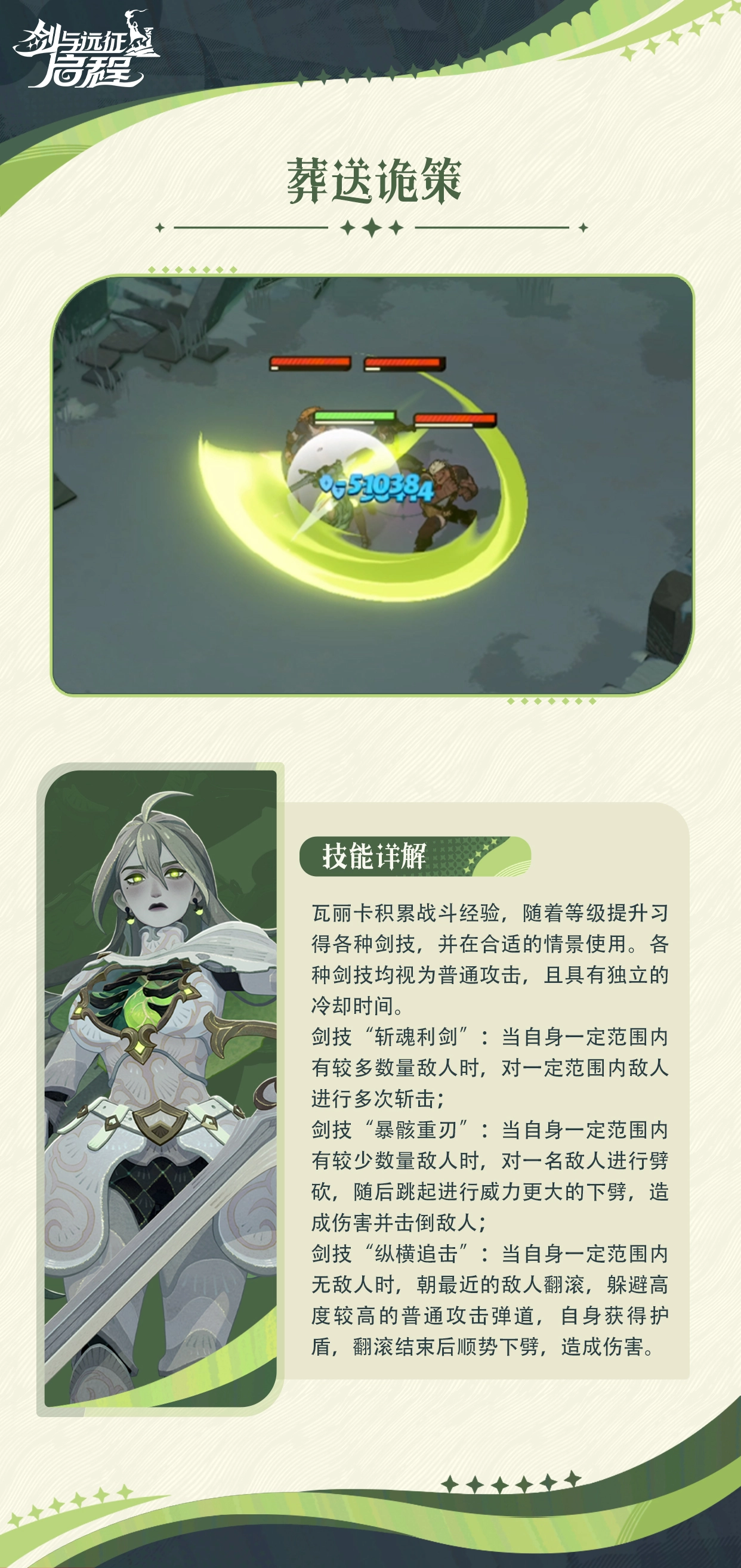 瓦丽卡,白山公国往昔坚毅的骑士统领,其剑术超凡绝伦,骑士精神令人由衷敬佩。为抵御冰恶魔、捍卫祖国,她英勇献身。但执念与未竟的使命,使她再度降临尘世。下面,就由小编为大家详细介绍《剑与远征:启程》中瓦丽卡的技能!
