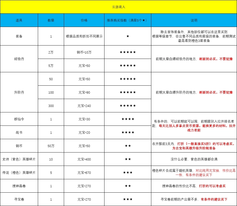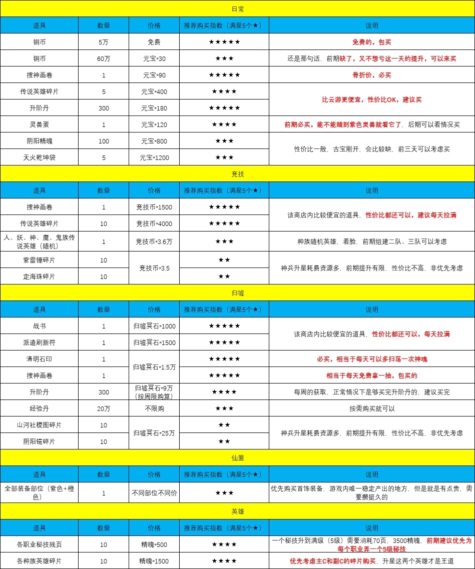 如需了解商城内的产出及购买推荐,请查看以下表格,建议您收藏。