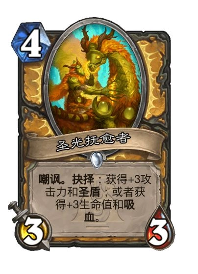 嘲讽。面临抉择:要么获取 +3 攻击力与圣盾;要么获取 +3 生命值与吸血。