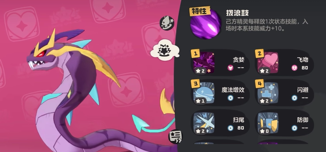 寒音蛇的“拨浪鼓”特性,堪称其威力的重要加成之一。每当寒音蛇施展一次状态技能,且己方精灵入场时,本系技能威力便会提高10点。如此加成,使得寒音蛇的输出潜力近乎跃升至全新高度。特别是在战斗的后期阶段,寒音蛇凭借自身超高速度以及技能加成,能够轻而易举地补刀收割敌方精灵。