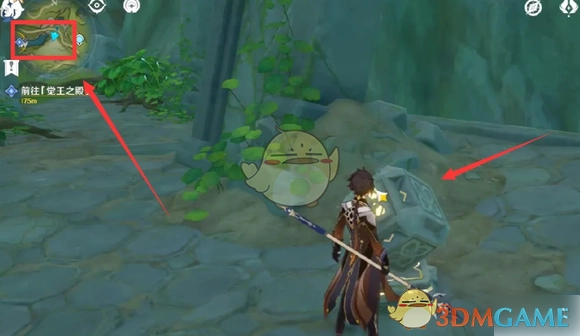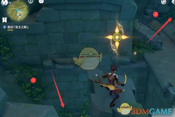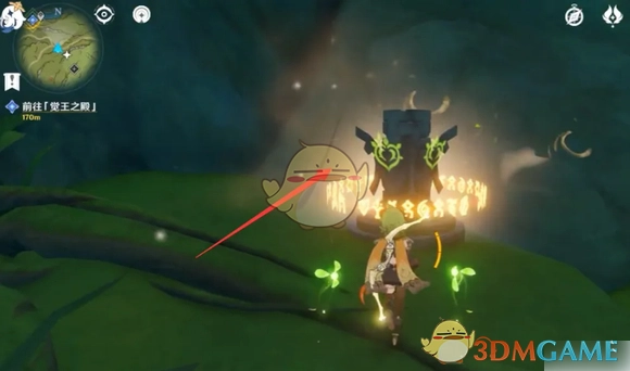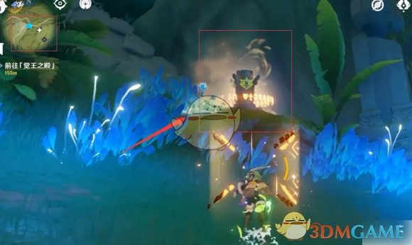 2、沿着路线一直走到尽头,你会瞧见一个四叶印,它与一根石柱相连。在石柱的左下方以及右下方,各有一个草元素方碑,将它们点亮。
