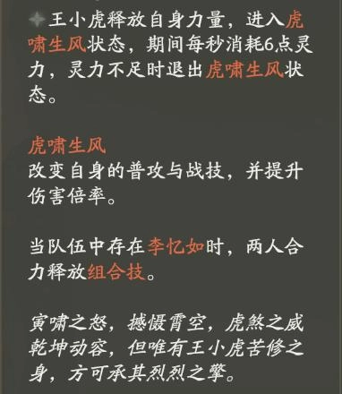 激发自身力量,进入虎啸生风状态,该状态每秒消耗6点灵力,若灵力不足则自动退出。处于此状态时,普通攻击与战斗技能的形态会发生改变,伤害倍率提高,同时还能够与李忆如触发组合技。