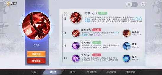 在阴阳术的选择上,高级阴阳术选取秘术·迅法,此技能能够提供加速追击的手段,与大岳丸持续输出的特性高度契合。中级阴阳术则挑选秘术·影狩、符咒·御风以及符咒·灭。其中,秘术·影狩可提供额外伤害,符咒·御风能够提升移速,符咒·灭具备斩杀回血的效果。在前期支援时,这些中级阴阳术有助于增加输出;而在团战过程中,它们方便玩家进行追击与收割。至于初级阴阳术,选择主属性、移速以及穿透,主要侧重于输出能力与基础移速的提升。