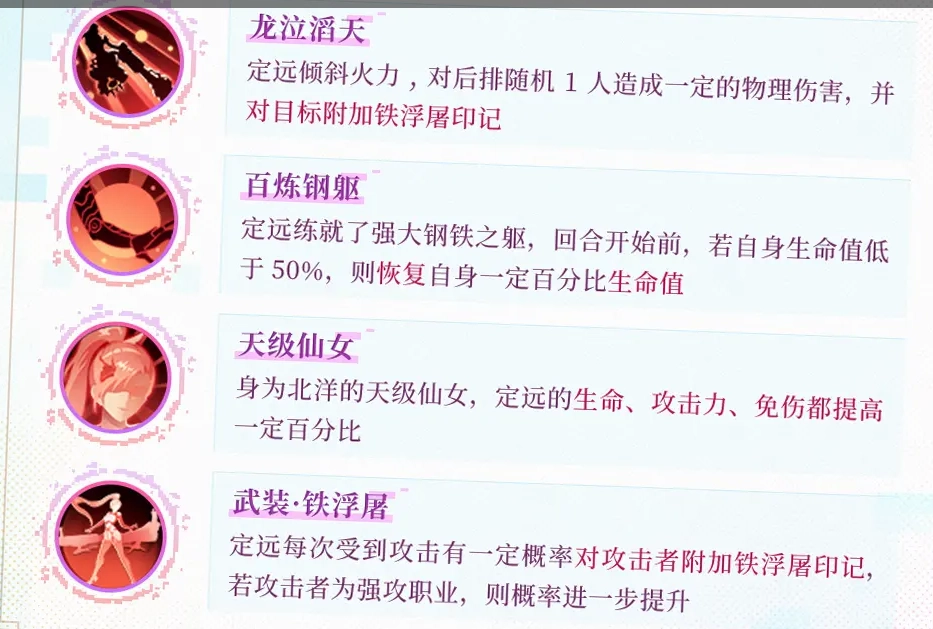 定远锤炼出了坚不可摧的钢铁之躯,在每回合开启前,倘若自身生命值低于百分之五十,便会恢复自身一定比例的生命值。
