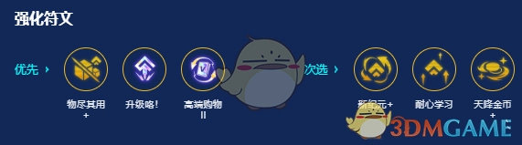 优先选取经济类与经验类的强化符文,通常搭配为2个经济类符文和1个战力类符文。