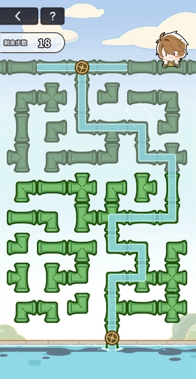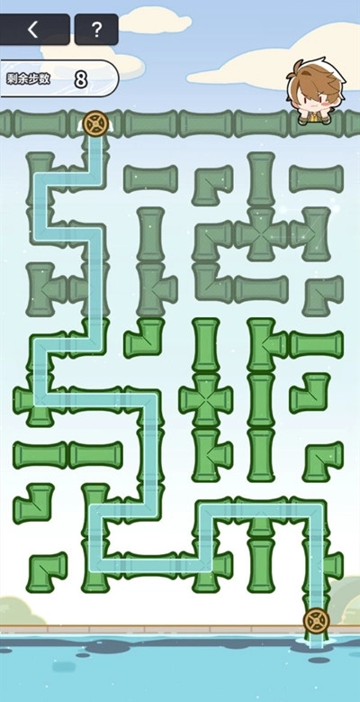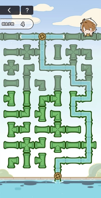 在规定步数内,沿顺时针方向转动水管,让水流从入水口顺畅地流向出水口,就能通关成功。