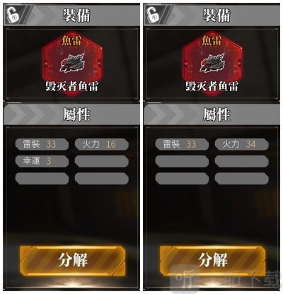 从图中可以看出,有两个装备,它们的种类是相同的。左边的装备强化了1次,幸运值为 +3 。而右边装备的火力值显著高于左边。经过对比,我们很容易就能分析出,右边装备天生的强化属性所增加的火力值,等同于强化1次所加的火力值。然而,仅仅强化1次,右边装备的火力值竟然比左边高出了整整18点!
