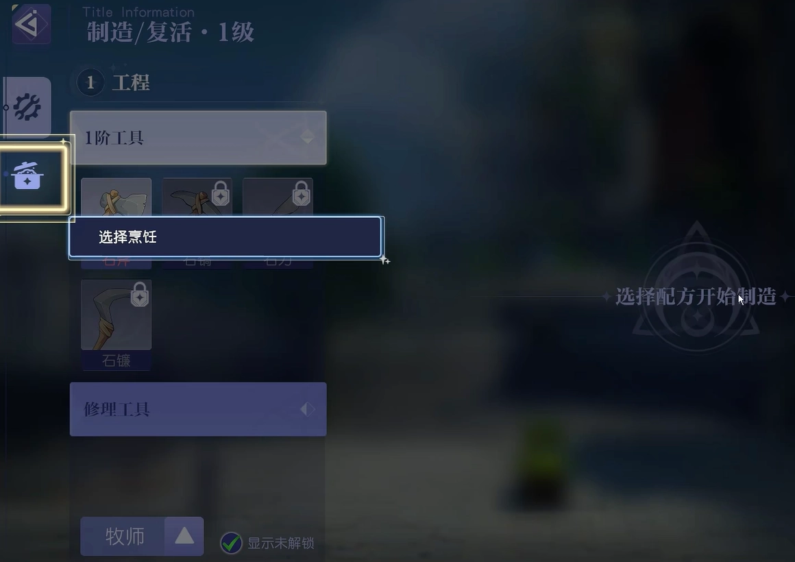 随后,我们与营地进行对话,点击第一个“打造”选项,便能进入。其中第二个选项是烹饪。烹饪又细分为两类,第一类是我们常见的药剂。药剂属于烹调范畴,通常用于恢复血量。然而,我们的目标是制作美食,因此建议点击下一个选项。