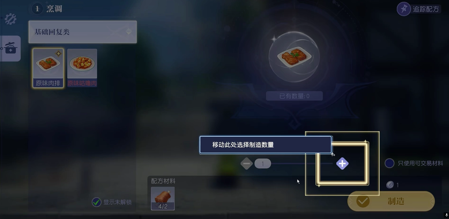 即所谓的基础回复类,首先映入眼帘的是原味肉排。点击它后,就能把你现有的羊肉碎块加进去,若要制作一份,得花费两个肉块。接着选择你想制作的数量,通常两个就行,一个售价一枚银币。随后点击右侧的“制造”,稍作等待,烹饪便可开始。
