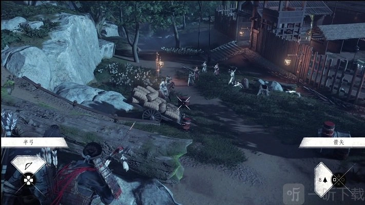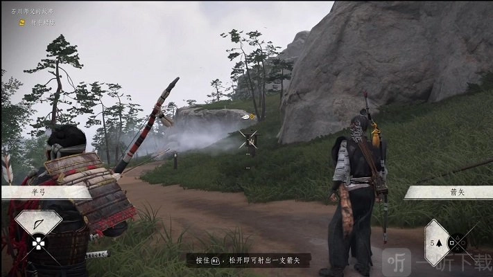 继续向前行进,完成剧情调查后,便会触发石川师父赠予半弓的剧情,在此处将会练习弓箭的使用。