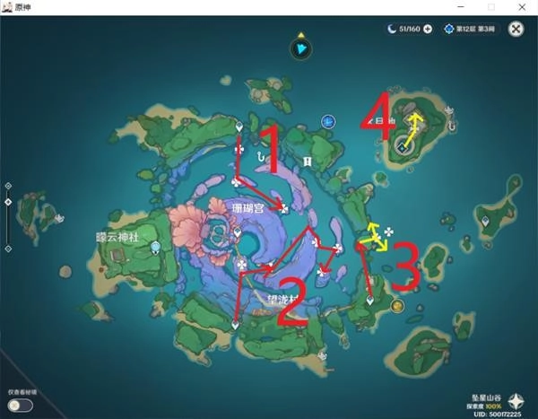 5. 珊瑚宫中心的漩涡与渊下宫的入口相连,首次前往可经由此处,后续直接使用渊下宫传送点即可。在渊下宫入口周边分布着几颗真珠,建议先做好标记,然后将标记点连线,按照连线的路线进行采集。