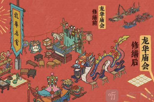 1热闹欢乐的龙华庙会即将在江南小镇举办。届时,大家可以参与系列活动收集材料,用于修缮全新的联动建筑——龙华庙会。