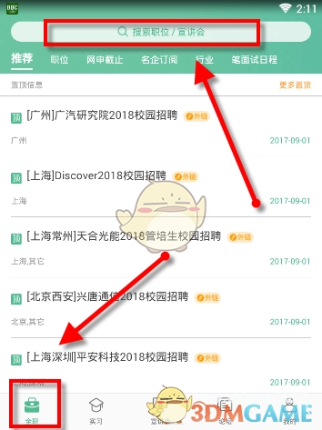 1、打开应届生求职app,在首页就可以点击上方搜索框