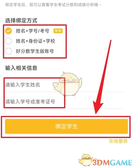 3、于【绑定学生】界面,挑选绑定方式,而后点击【绑定学生】按钮。