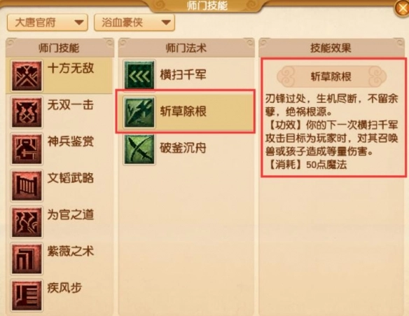 消耗五十点魔法,若下一次的【横扫千军】攻击对象为玩家,那么对其携带的宝宝或孩子造成与之等量的伤害。