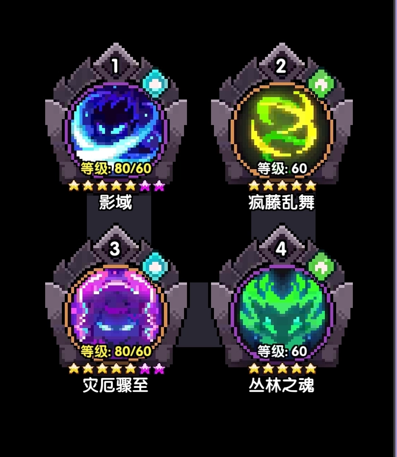影域、灾厄骤至这两个技能在通关小秘境100关后可以去技能宝箱抽取新水技能,而丛林之魂、疯腾乱舞可以在普通魔女技能宝箱抽取,但是丛林之魂和疯腾乱舞是可以在[技巧试炼]通关奖励获取。