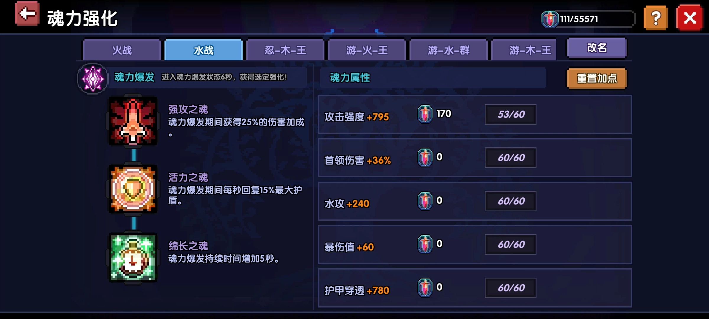 [魂力属性]优先点满护甲穿透、暴击值、首领伤害,然后水攻、爆伤1:1点,随后攻强(上面的攻击强度)、无限攻强(下面的攻击强度)8:3分开点