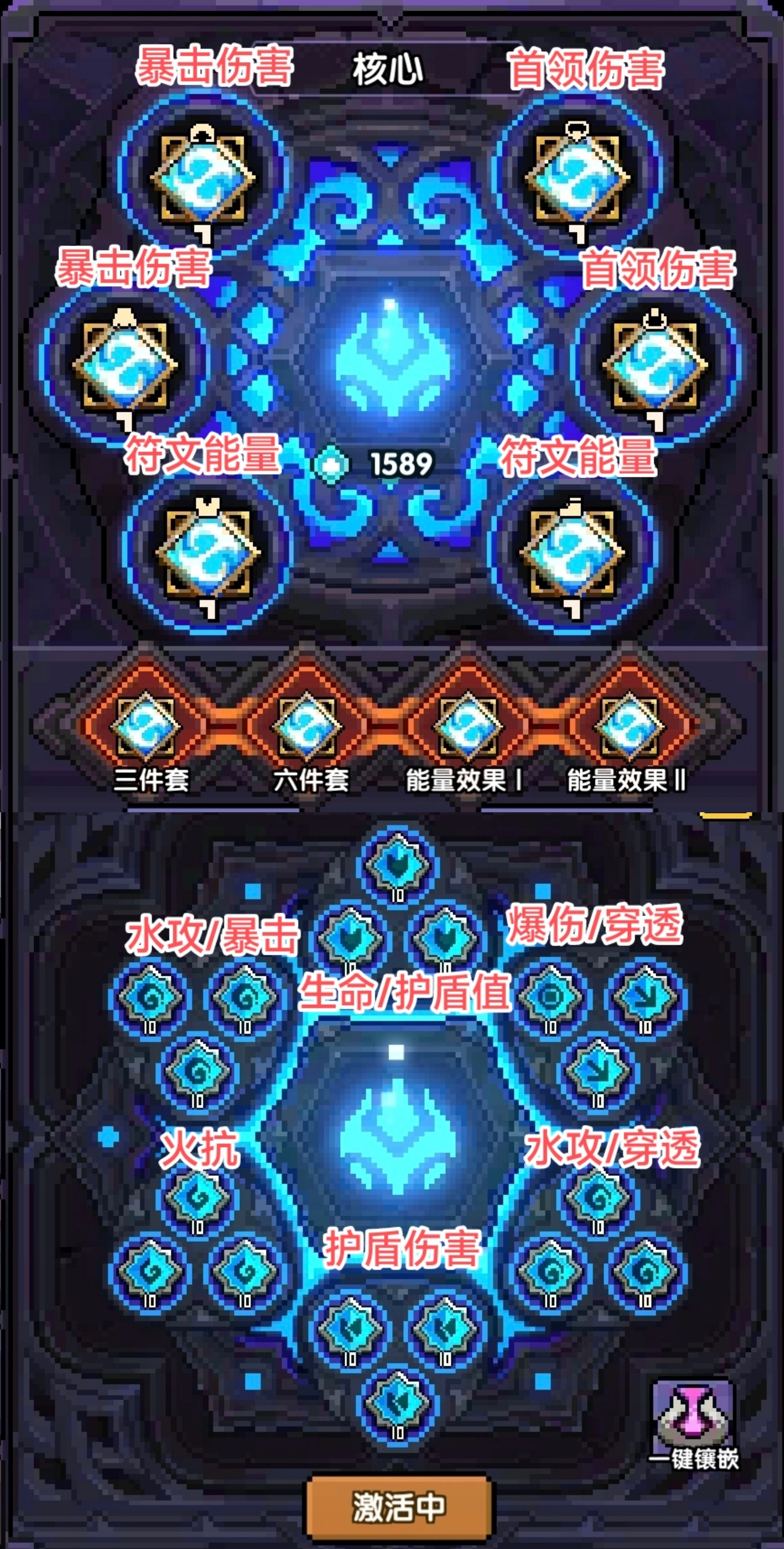 [核心]在打BOSS和内桩的时候,项链、戒指位置(对应上半图中右上、右的符文)携带“首领伤害”,打小怪秘境时携带“护盾伤害”,打竞技场时携带“攻击强度”