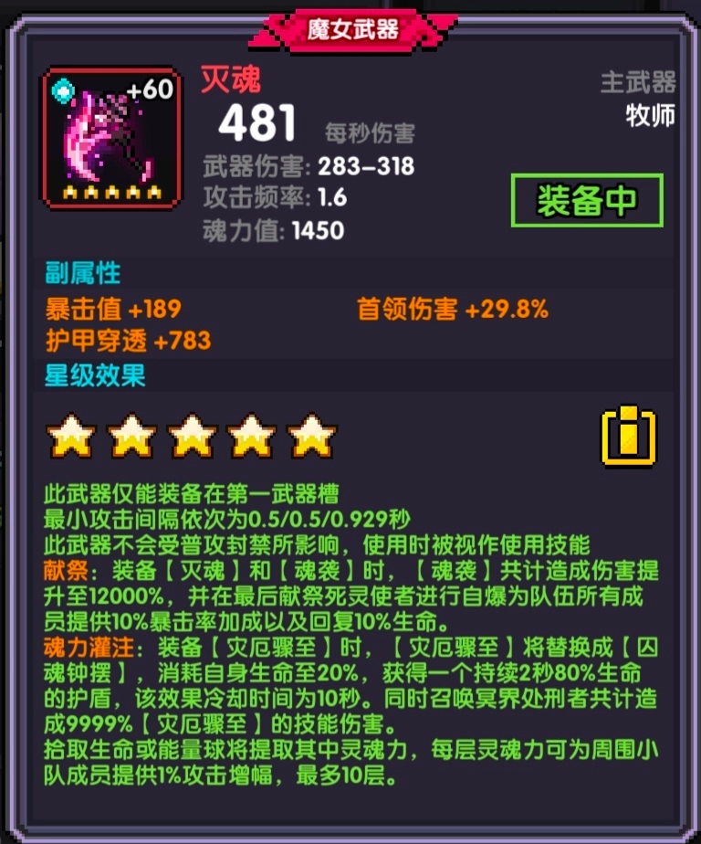 此次牧师受武器符文作用,橙色技能的冷却时间变为固定值,同时释放技能还会扣除自身血量。当牧师进入审判状态时,会掉落生命球,且技能命中目标后,会降低目标对应的元素抗性。