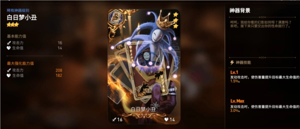 1、白日梦小丑:要是游戏侧重于PVE副本,这件神器就会成为额外的选项,在刷龙场景中能有出色表现。