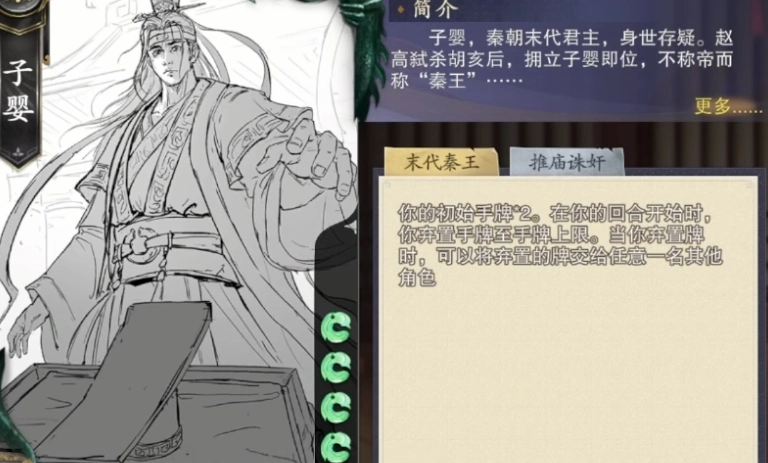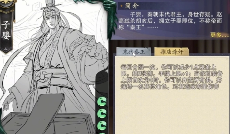 每当回合开启,子婴必须把手牌弃置至手牌上限。这一行为看似无奈,然而他能够把弃掉的牌交给任意一位其他角色,这无疑对队友形成了支援,同时也干扰了敌人。这种灵活处理手牌的能力,使得子婴在游戏里成为一个难以预料的变数。而“推庙诛奸”技能,更是把子婴的战术深度提升到全新高度。每回合仅能使用一次,子婴可以降低1点装备上限,进而摸取3张牌,并且手牌上限也会相应增加1点。