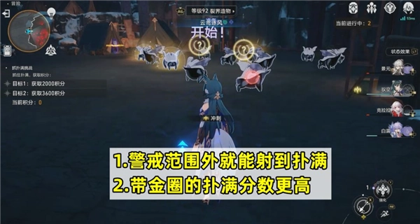 借助远程角色的射程优势,即便看不到扑满身上出现锁定的红圈,只要方向正确,实际上就能射中。远程射击的优点在于,能够在不惊扰其他扑满的前提下,逐个将扑满抓完,进而拿全奖励。这里有两个关键要点:其一,把所有扑满抓完可获得4400分,但要拿全奖励只需3600分,这意味着存在一定的容错空间;其二,身上带有金圈的扑满分值更高,金圈扑满是500分,普通扑满则为200分,所以应当优先抓取金圈扑满。