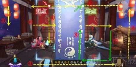 1. 起始于起点位置进行绘制,线路径直垂直向下(沿箭头方向前行);抵达底线后,朝右转弯,接着一直水平向右绘制(跟随箭头指引),直至神龛的木腿处,随后转向往上弯折。